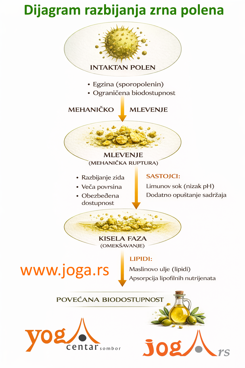 Većina ljudi koristi polen u zrnu, ne znajući da je njegova opna nesvarljiva (ta opna je tvđa od čelika). Moj eliksir koristi mleveni sirovi polen, koji se odmah obmotava u ekstra devičanskom maslinovom ulju, uz posebnu tehniku i redosled mešanja. Ulje ne samo da čuva polen od kvarenja (oksidacije), već služi kao idealan transportni sistem za sve vitamine rastvorljive u mastima. Uz dodatak meda, limuna, propolisa i cimeta, stvorio sam „pametni“ sistem koji hrani dobre bakterije, a eliminiše patogene (vidi Digram).